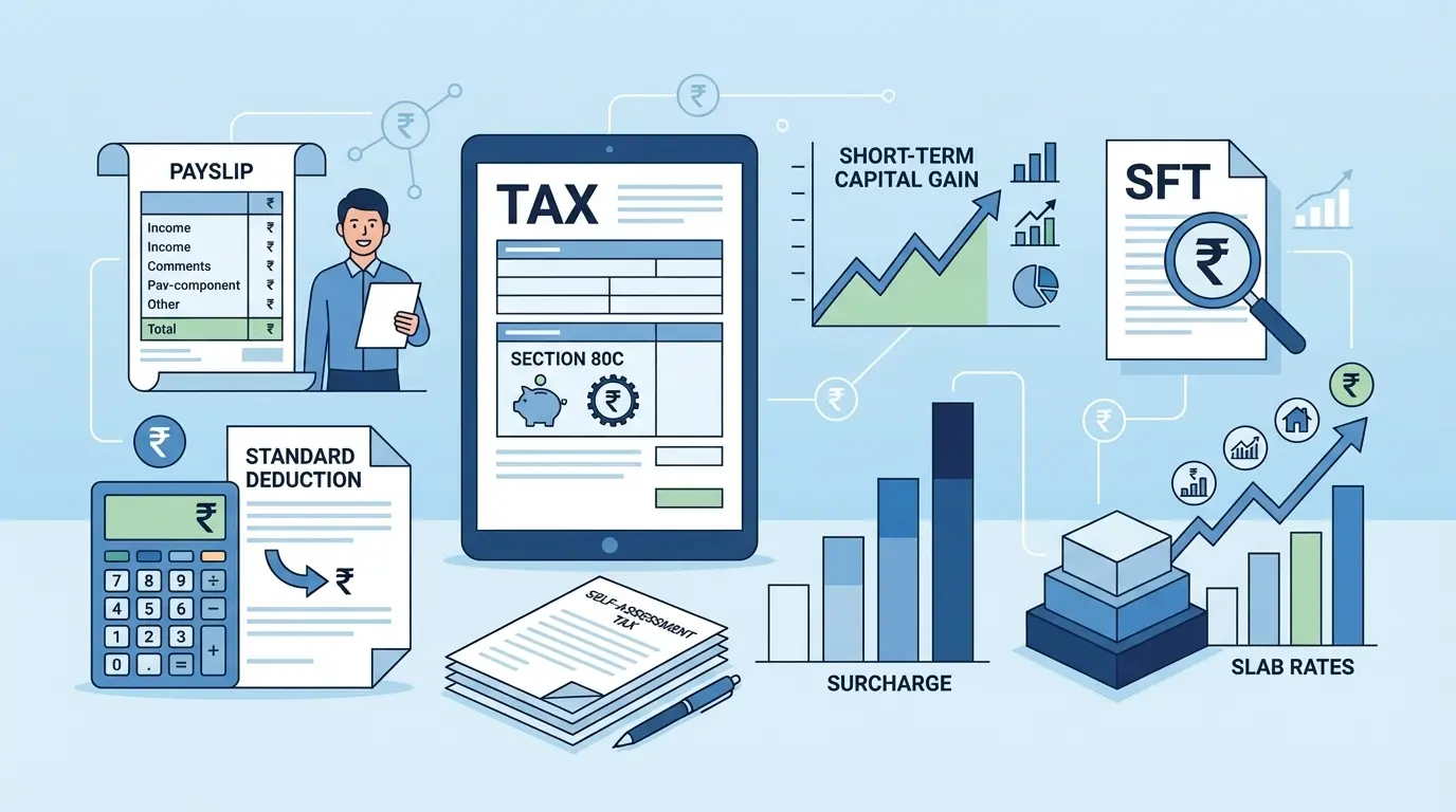 The letter S includes some of the most important income tax concepts used by taxpayers. This section of the income tax glossary explains terms such as Salary, Standard Deduction, Section 80C, Surcharge and Short-Term Capital Gains in simple language.